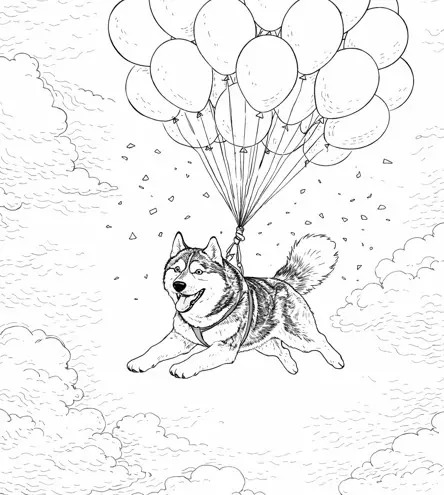 Хъски лети с балони – безплатна картинка за оцветяване за деца